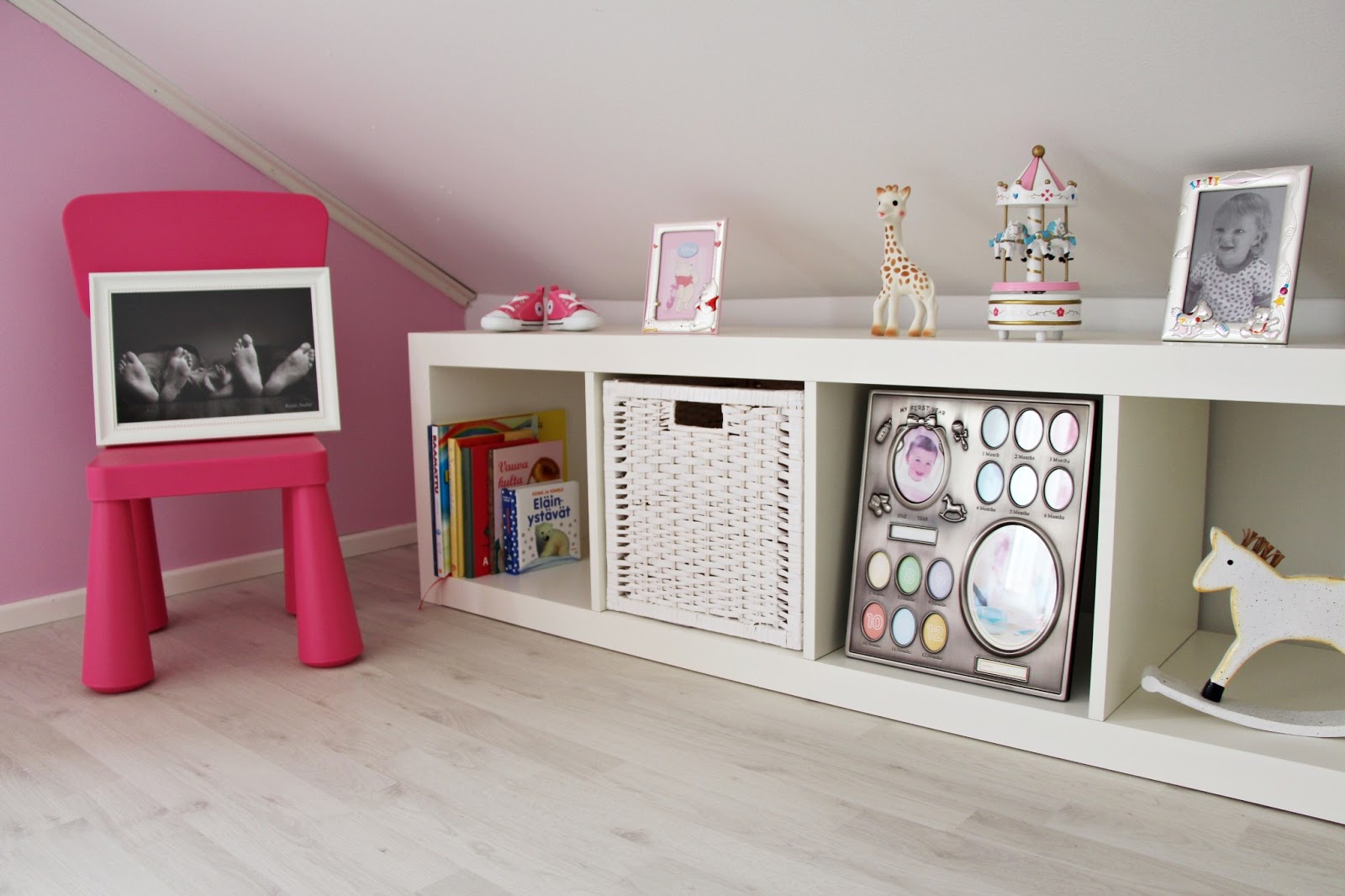 Tajusin etten laittanut koskaan kuvaa siitä Ikean hyllystä, jota kasasin toukokuussa. Expedit-hylly päätyi siis ”väärinpäin” tytön huoneeseen, katto on 50cm ”korkealla” tuolta matalimmasta kohdasta, joten oli vaikeaa keksiä mikä hylly sinne mahtuisi. Mutta tämä mahtui!