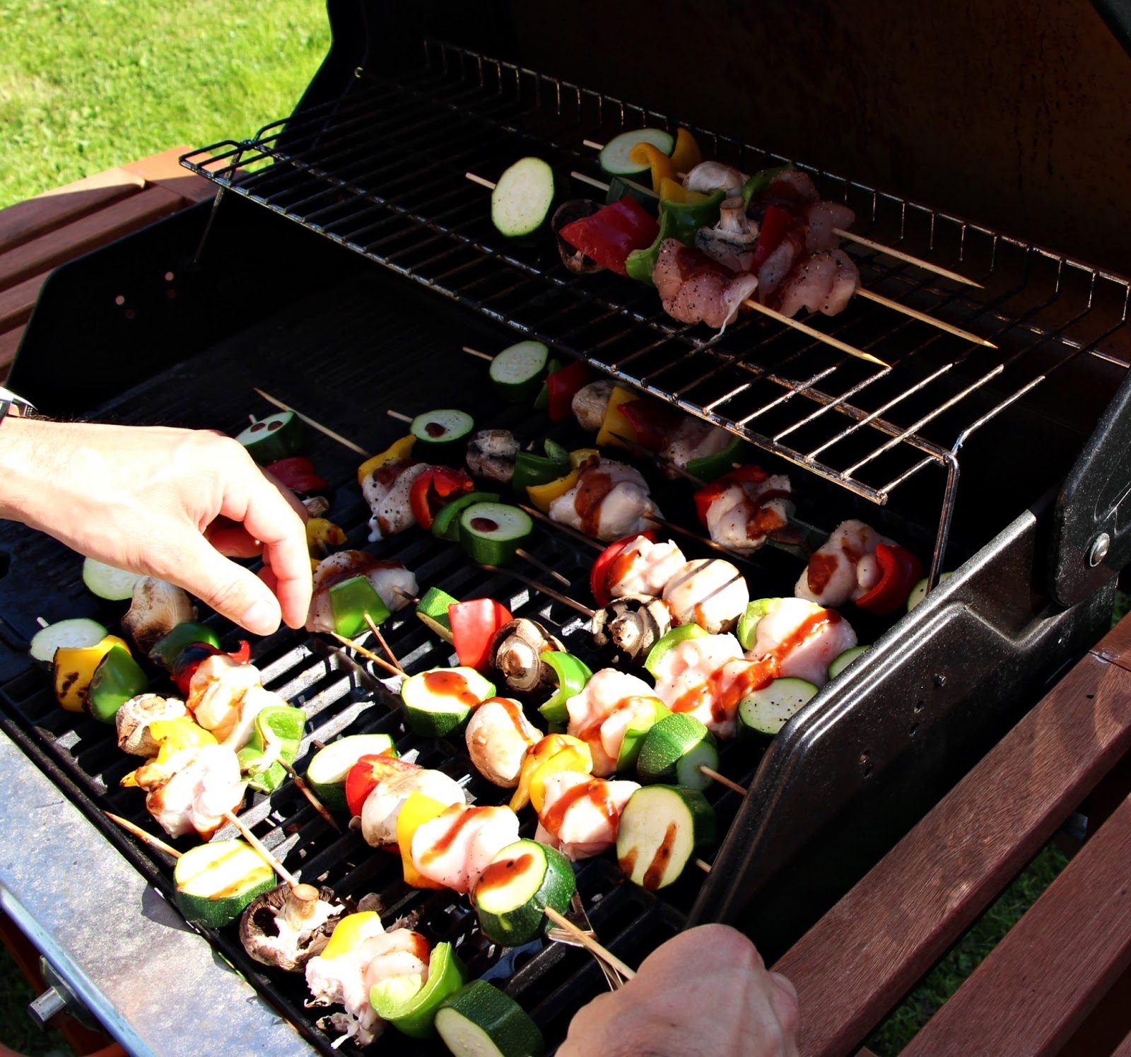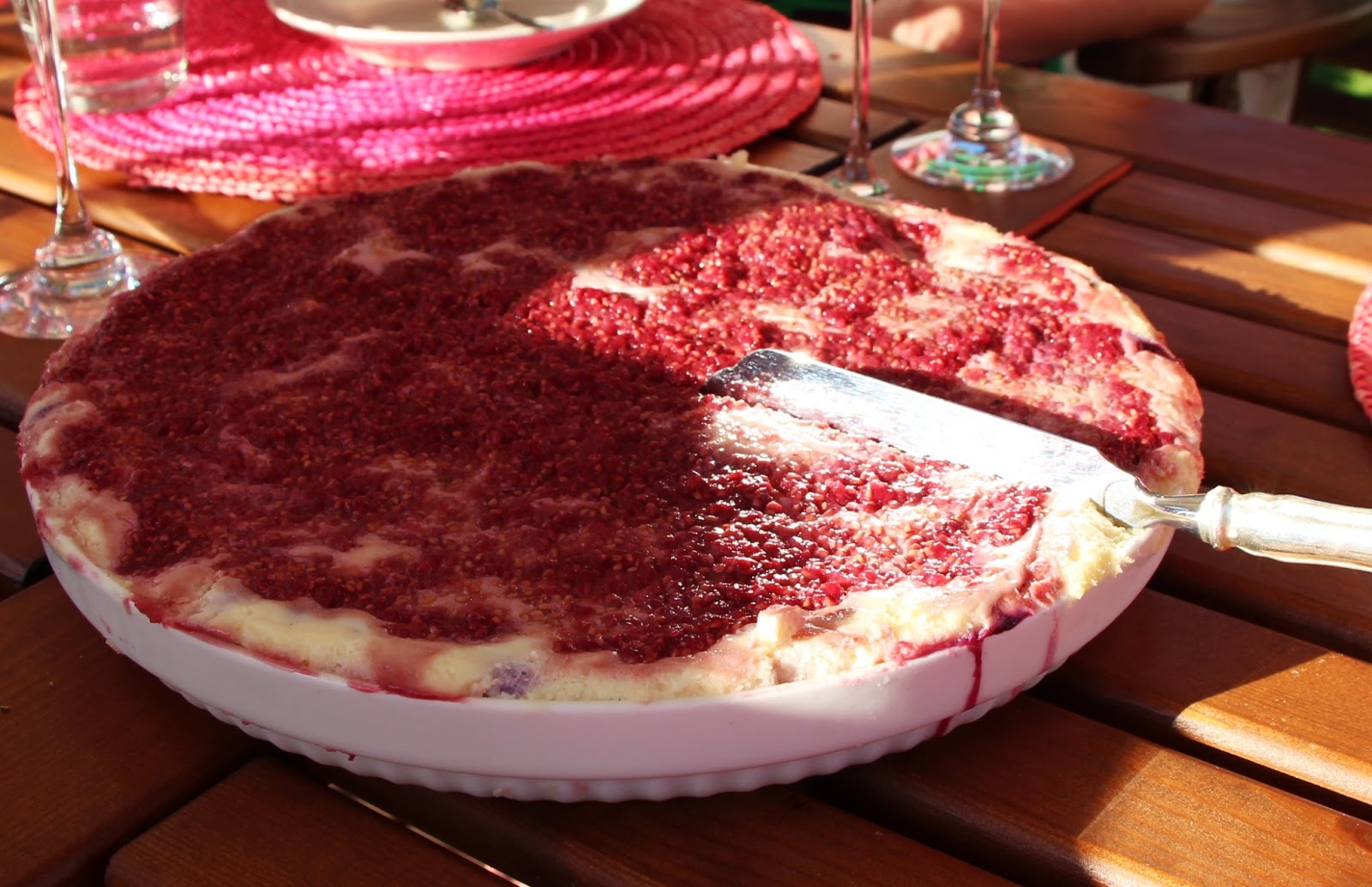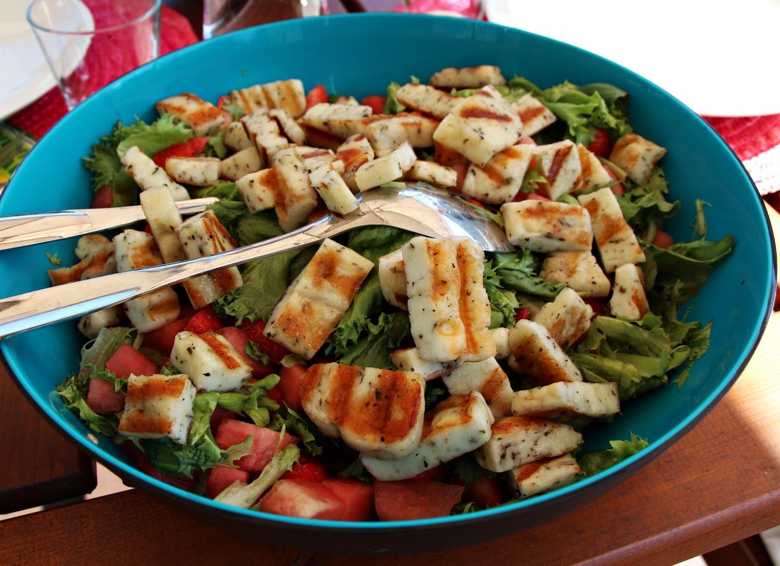 Juhannusruokina meillä oli lohta, mansikka-meloni-halloumisalaattia, kanavartaita, mansikkarahkakakkua, valkosuklaa-vadelma-juustokakkua (ohje uusin Me Naiset) sekä kirkasta perunasalaattia uusista perunoista. Olen viimeksi syönyt näin paljon varmaankin jouluna. Punaista lihaa en syö, joten makkarat ja pihvit jäävät täällä grillaamatta.