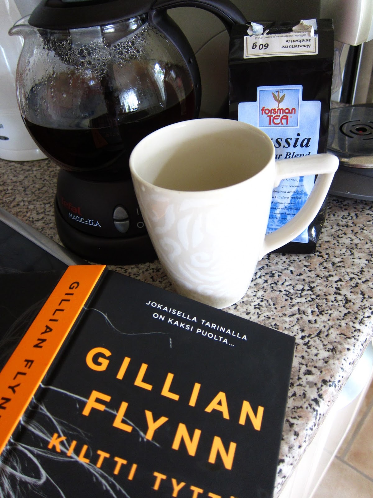 Fiilistelen täällä siis tiistaina ostamaani teekeitintä, miksei ihmisellä joka juo mukitolkulla teetä päivittäin ole tällaista? Olimme kaverin luona käymässä tiistaina ja hänellä oli tämä keitin, joten marssin illalla Kodin Ykköseen ostamaan samanmoisen. En ole eläessäni juonut pisaraakaan kahvia ja silti meillä on tuplana kahvinkeittimiä. Joten tämä oli ehdottomasti 39 euron arvoinen satsaus, nam nam!