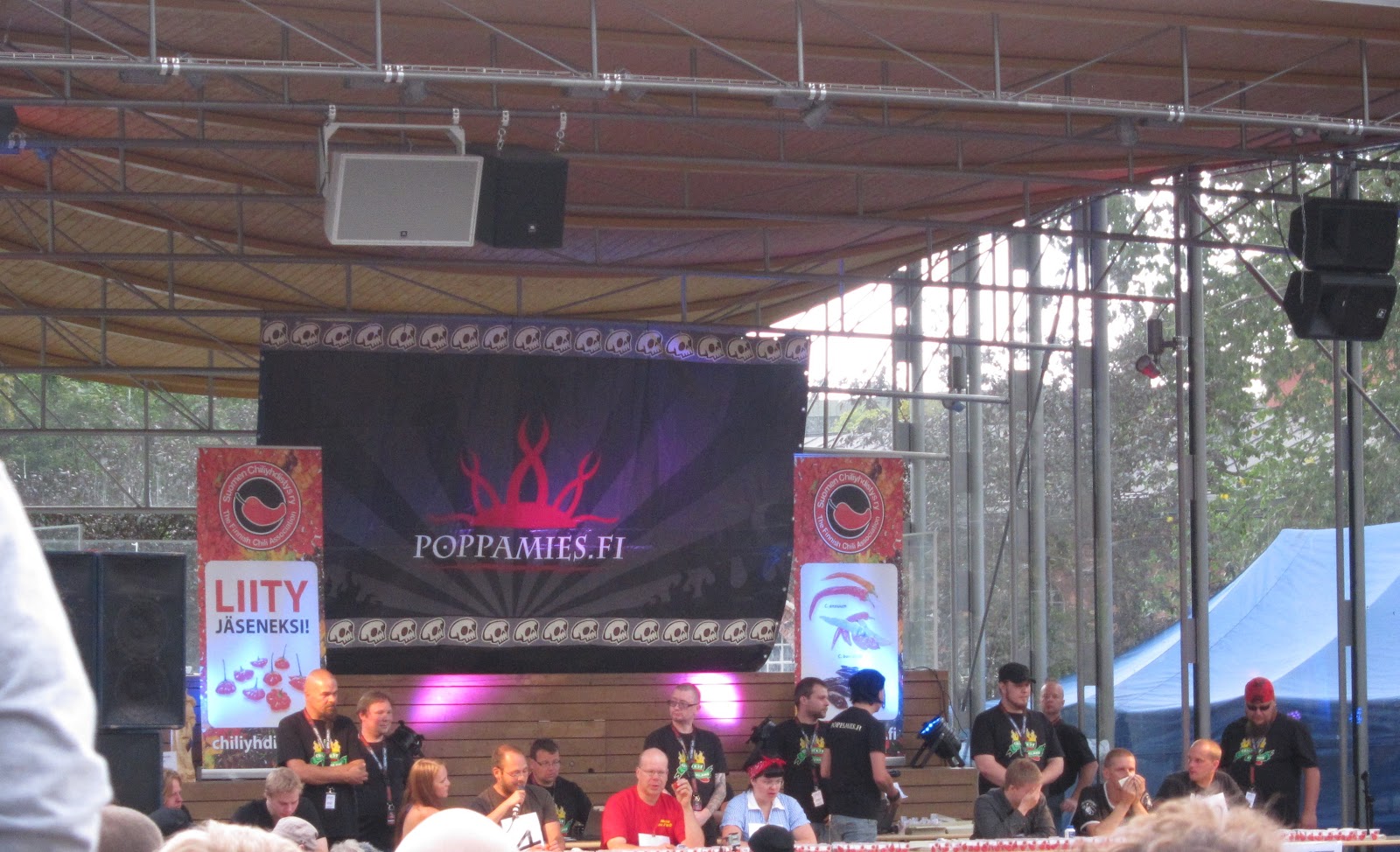 Katselimme myös naga-syöntikisan ja minulle tuli aivan kamala sääli kilpailijoita kohtaan, niin tuskaiselta se syöminen näytti. Uusi maailmanennätys kuitenkin syntyi, kun Janne Kiviniemi popsi yli 200 grammaa chiliä. Huih! Sympatiapisteet sinne, tuo ennätys varmasti vaatii veronsa olossa… Voittaja löytyy kuvan oikeasta reunasta.