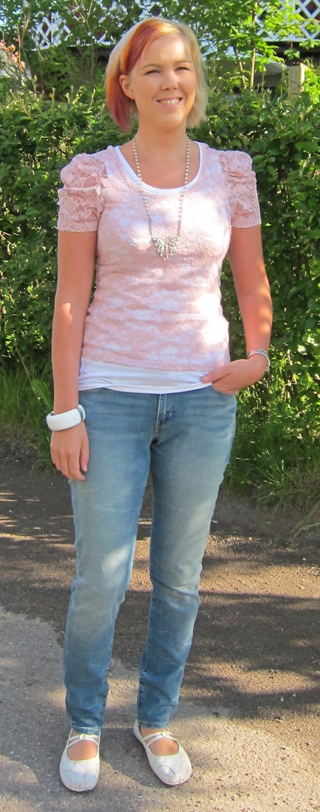 Myös päivällä oli pari NY-ostosta päällä, nimittäin Leviksen farkut ja se Forever 21-pitsipaita. Mua jäi hämäämään onko noi housut liian lököt, mutta tuumaa pienemmät puristi jo aika tavalla. Ehkä se vaan hämää, että ne tosiaan farkut, ei mitään strech-jutut tai jeggingsit tai mitään. Onko noi teidän mielestä lököt reisistä? Perhoskoru on kaverin kaupasta Phuketista ostettu.